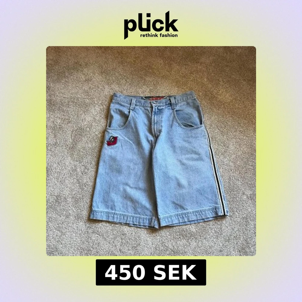 Säljer ett par loose fit blå jeansshorts från Skunk med coolt broderat märke framtill och breda ben. Shortsen har klassiska fickor, dragkedja och bälteshällor. Snygg randig detalj längs sidan och tillverkade i 100% bomull. Perfekt för chill dagar.