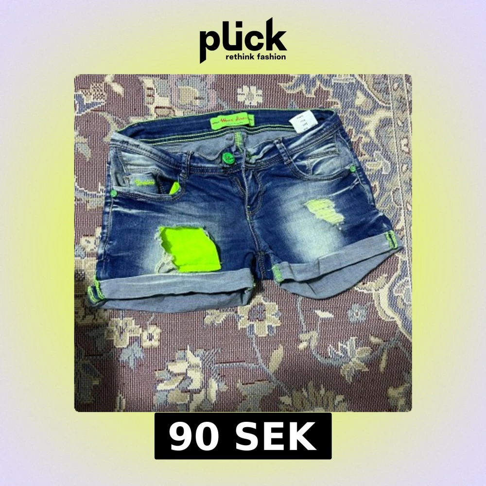 Snygga blå jeansshorts från Miss Anna med coola slitningar och neon gröna detaljer. Den är lågmidjan och ganska fin att ha på sig på varma sommardagar. Den är XS men den passar ganska bra även på S