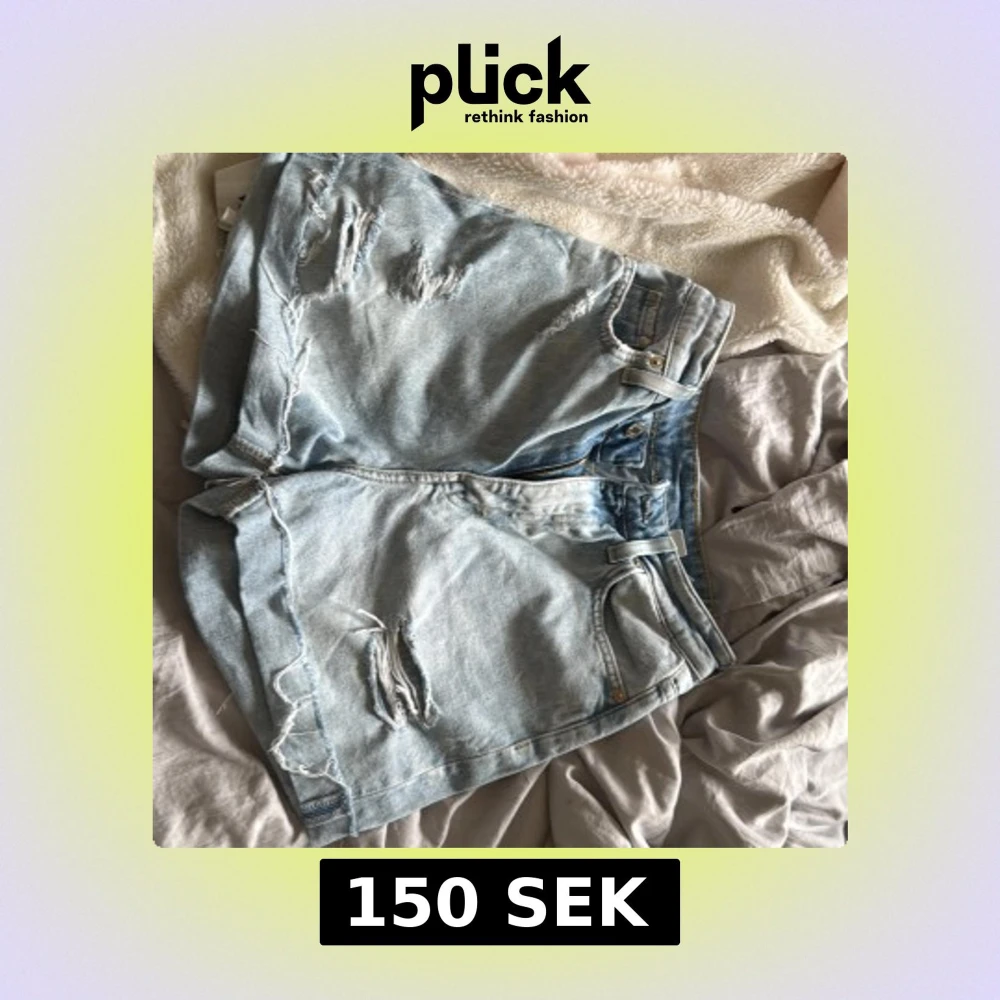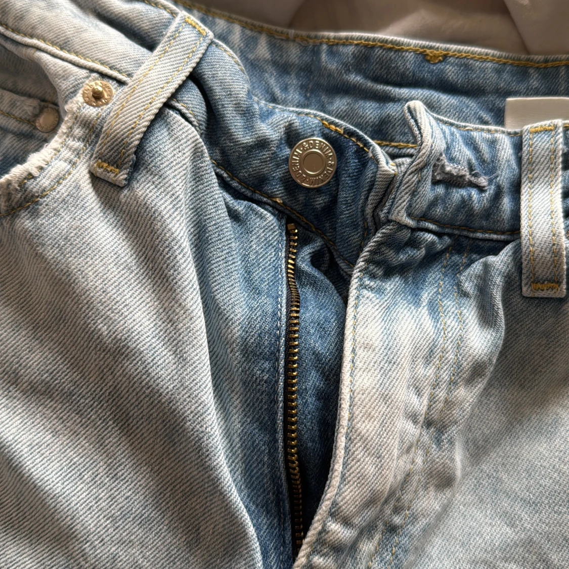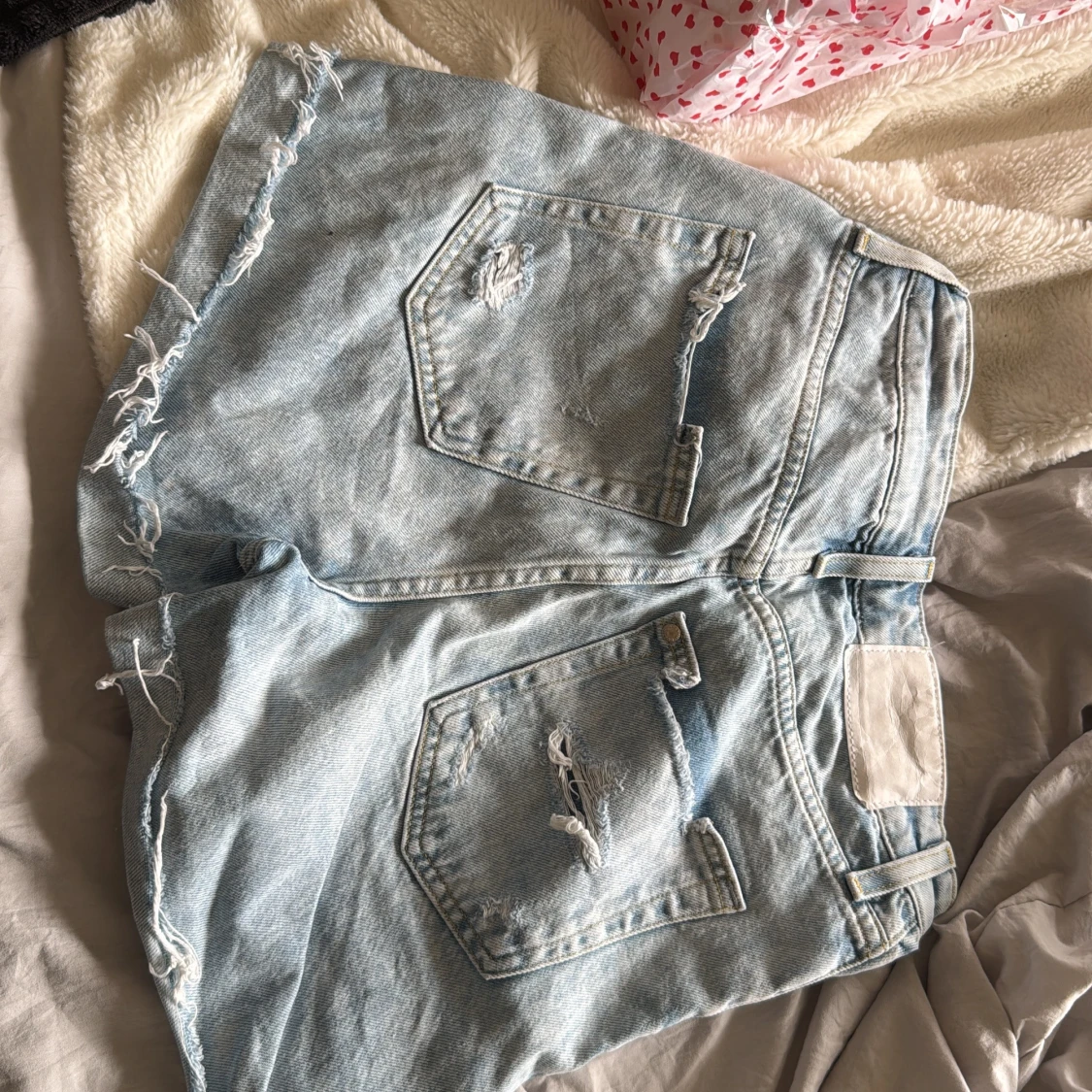Säljer ett par ljusblå mom shorts från &Denim med ultra high waist. De har slitna detaljer, råa kanter och klassisk femficksdesign. Dragkedja och knapp framtill. Perfekta för en chill och trendig look.