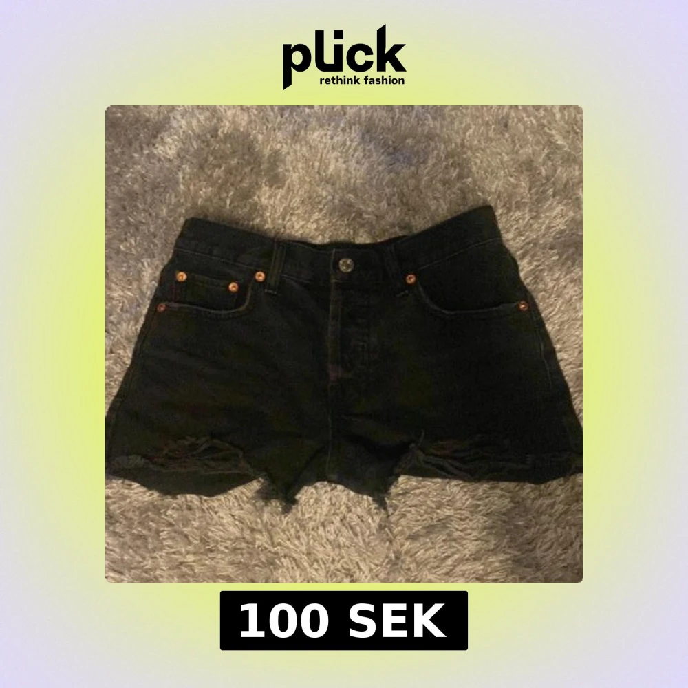 Snygga svarta jeansshorts med hög midja och råa, fransiga kanter. Shortsen har slitna detaljer framtill och klassiska fickor både fram och bak. Perfekta för en chill sommarlook.
