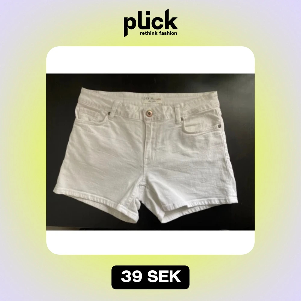 Klassiska vita jeansshorts med normal midja, lätta slitningar. Missfärgad midja från bälte, mycket försvann i tvätten så kanske går det att få bort ännu mer. Mått får ej plats - fråga gärna!