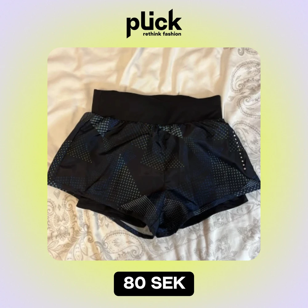 Ett par oanvända mörkblåa shorts till sport och fritid med svarta skyddande tights under, i storlek 32/34