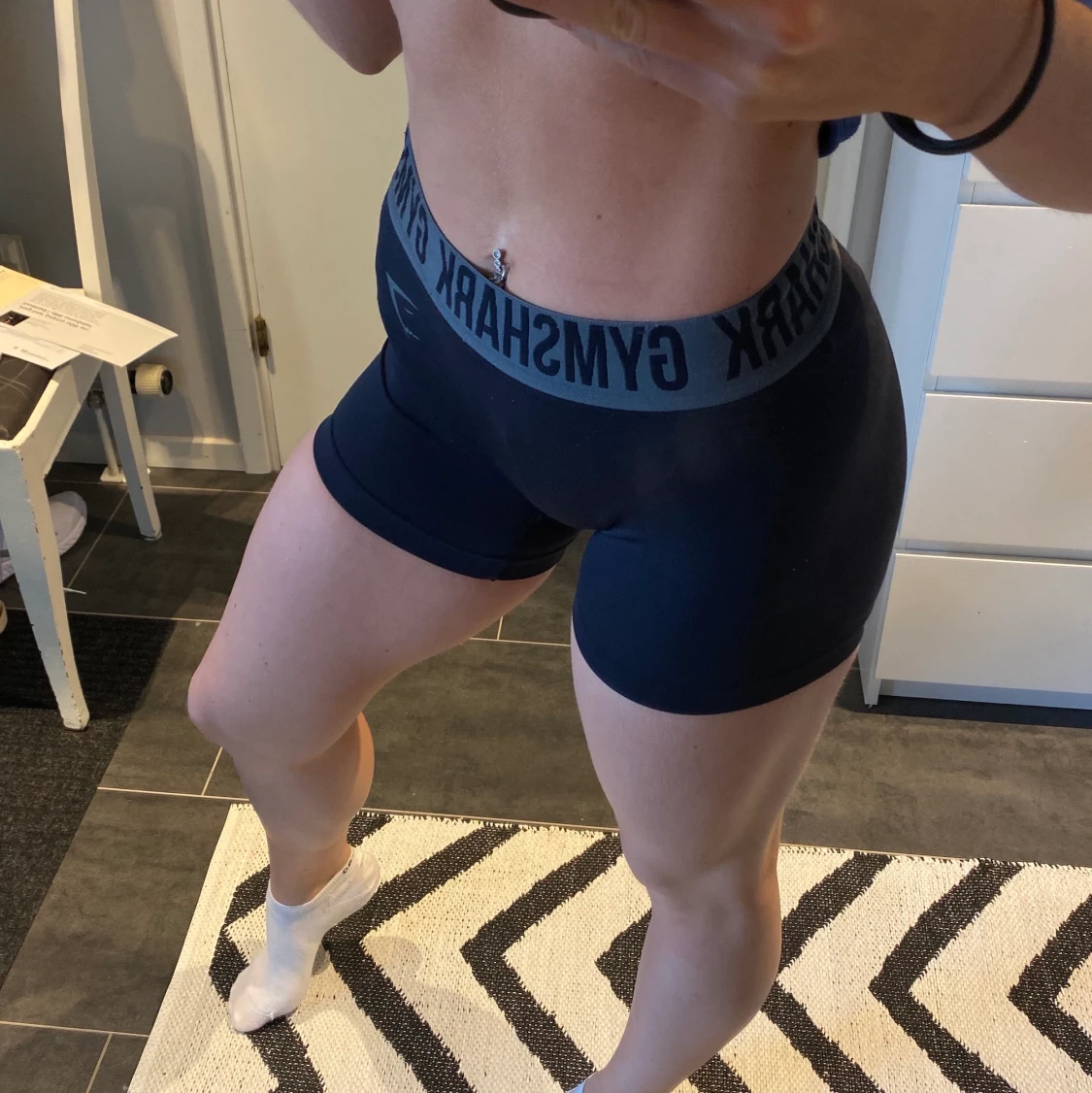 strl S, kollektion seamless fit tror jag. använda fåtal ggr, väller stretcha och sitter bra uppe tack vare gummiresår i midjan. lite nopprig men avslut inget synligt