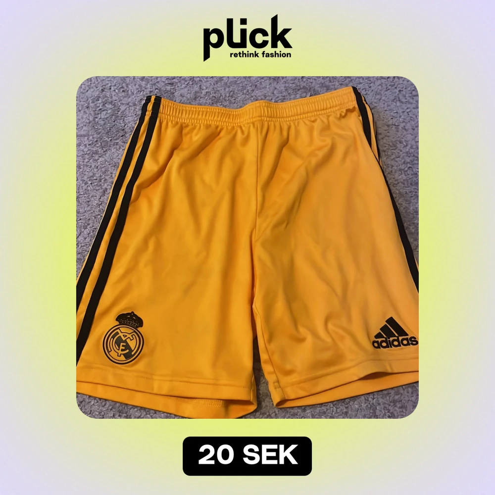 Säljer ett par gula fotbollsshorts från Adidas med Real Madrid-logga. De har svarta ränder på sidorna och är i bra skick. Perfekta för fotbollsträningen eller att bara chilla i. Storleken är inte angiven, men de ser ut att vara i en standard herrstorlek.