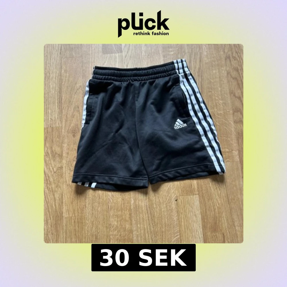 Svarta shorts från Adidas med klassiska vita ränder längs sidorna och elastisk midja. Perfekta för sport eller avslappnade dagar. Adidas-logga på vänster ben.