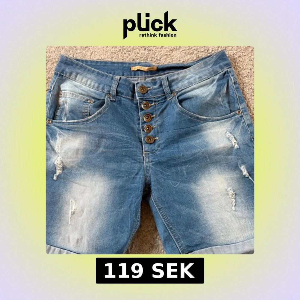 Snygga blå jeans från Place du Jour med slitna detaljer och coola slitningar framtill. Byxorna har hög midja, knäppning med flera knappar och en stjärndetalj på bakfickan. Jeansen är i klassisk denim med ljusa tvättade partier och raka ben.