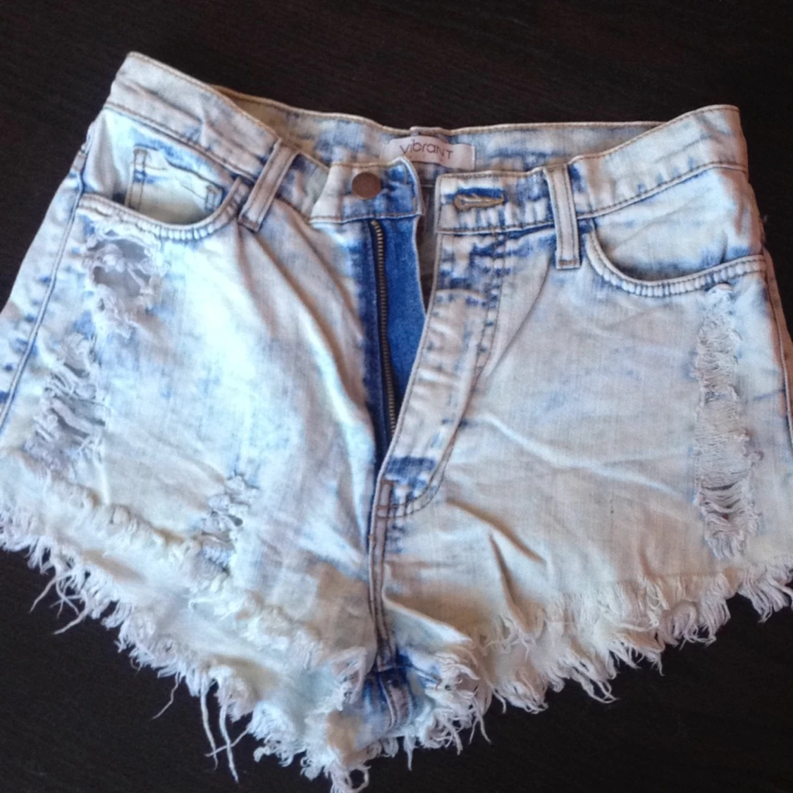 Ljusa, slitna, högmidjade jeansshorts från Vibrant m.i.u i storlek medium. Helt oanvända. Kan mötas upp i Stockholms innerstad. Köparen står för eventuell frakt.