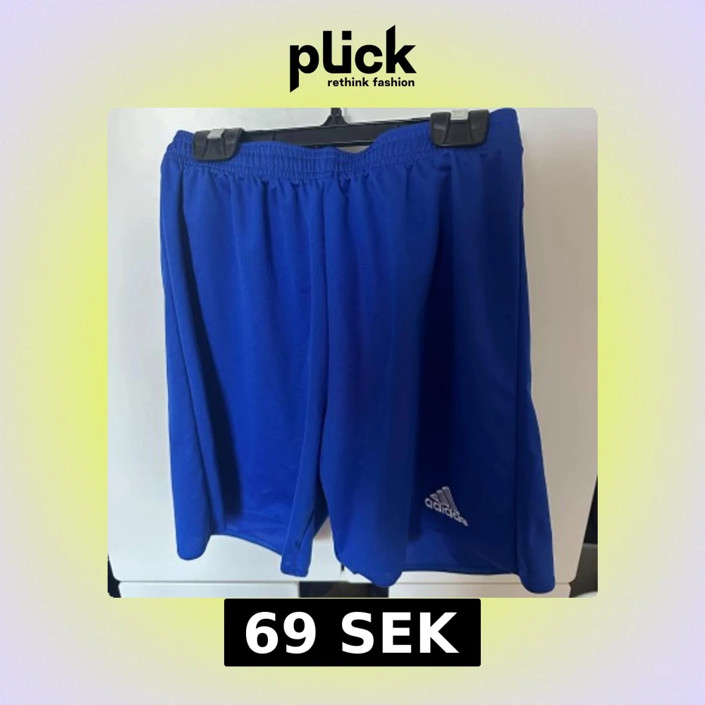 blå träningsshorts från Adidas med logga på vänster ben. De har elastisk midja och är tillverkade i ett lätt och svalt polyestermaterial. Perfekta för sport eller träning.