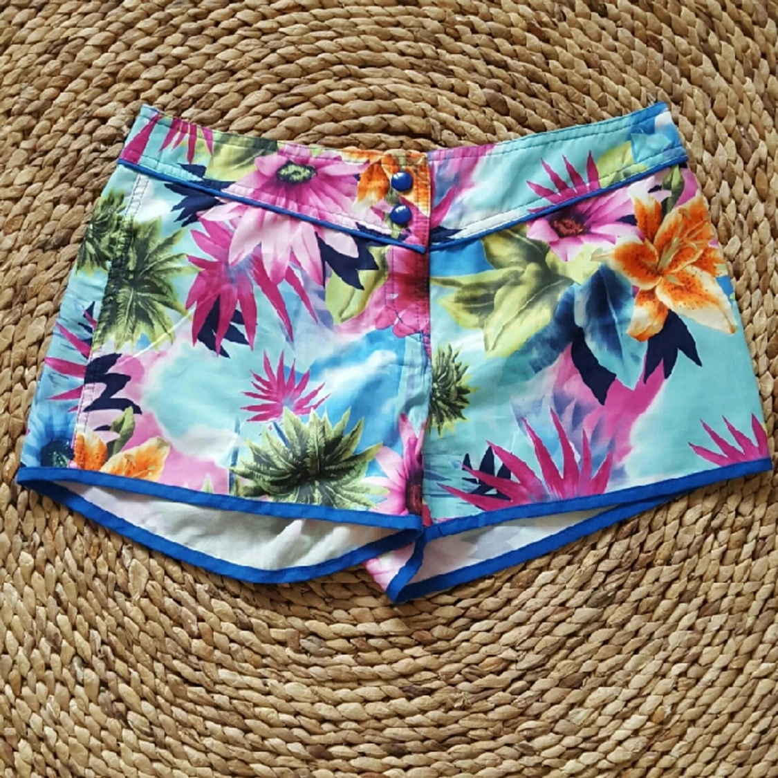 Ett par kortare partyshorts i badbyxmaterial. Riktigt festliga. knäpps med knapp och kardborre.