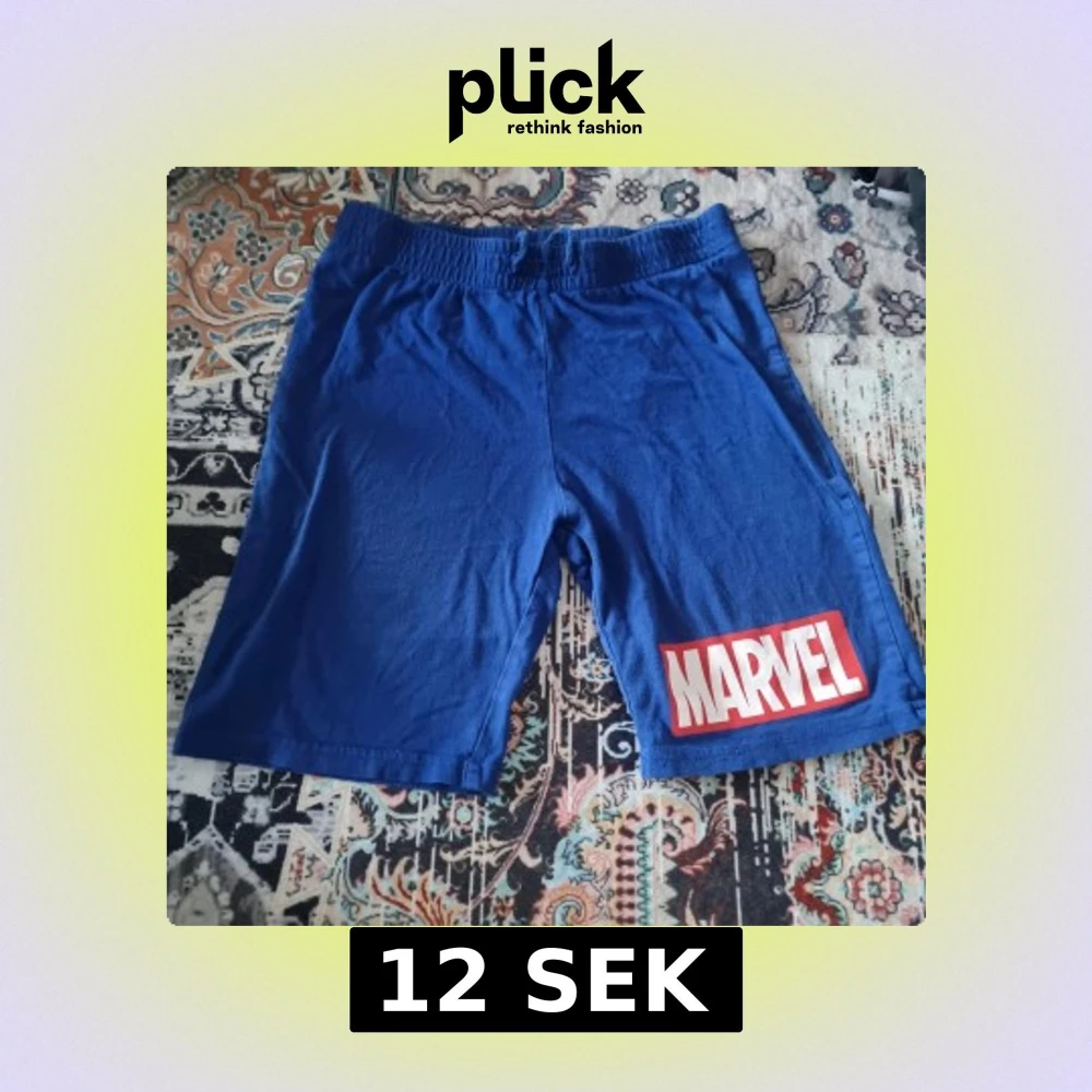 Snygga blå shorts från H&M med Marvel-logga i vitt och rött på ena benet. De har elastisk midja för skön passform och är gjorda i mjuk bomull. Perfekta för dig som gillar superhjältar och vill ha en avslappnad stil.