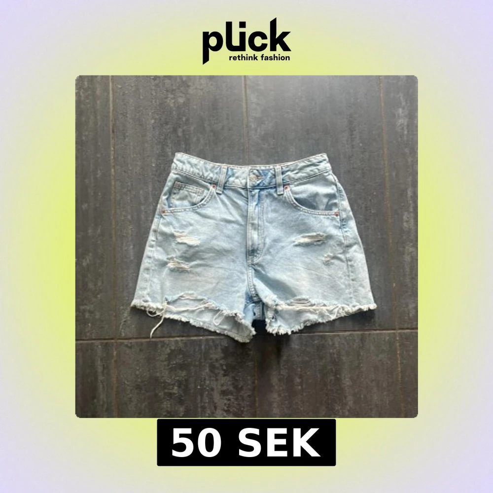 Säljer ett par ljusblå jeansshorts från H&M med hög midja och råa, fransiga kanter. Shortsen har flera slitningar framtill för en cool, avslappnad vibe.