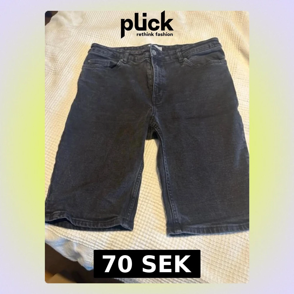Säljer ett par svarta jeansshorts med klassisk femficksdesign och bälteshällor. Shortsen har dragkedja och knapp framtill samt raka ben som slutar strax ovanför knät. Perfekta för en avslappnad stil i sommar.