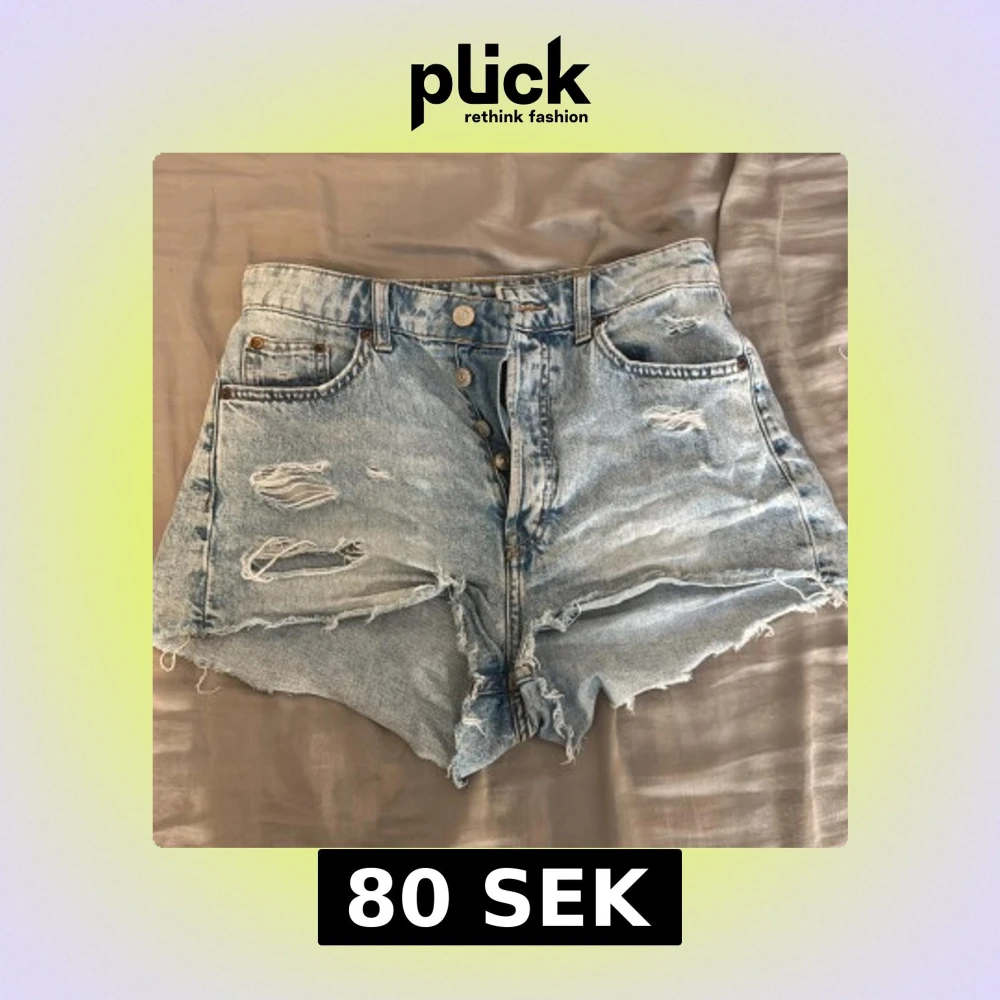 Säljer ett par ljusblå jeansshorts med hög midja och råa, fransiga kanter. Shortsen har flera slitningar och knappar framtill för en cool, avslappnad look. Perfekta för sommardagar och festivaler.