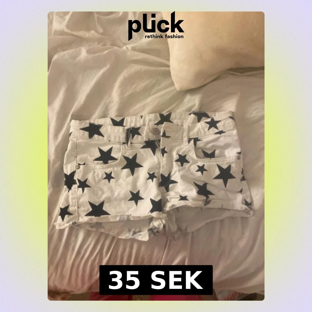 Säljer ett par vita shorts med svarta stjärnor över hela tyget. De har låg midja, klassisk femficksdesign och råa kanter nedtill för en chill vibe. Perfekta för sommarens alla äventyr och riktigt snygga till sneakers eller sandaler.