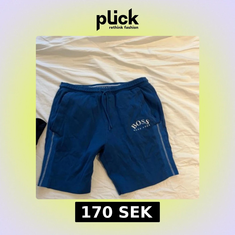 Snygga blå shorts från Hugo Boss med vit logga på vänster ben. Shortsen har snörning i midjan, sidofickor och dekorativa ränder längs sidorna. Perfekta för en avslappnad stil.