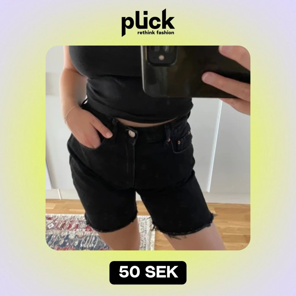 Svarta jeansshorts som är köpt second hand. Bra skick! Går att klippa av ytterligare om en vill ha kortare