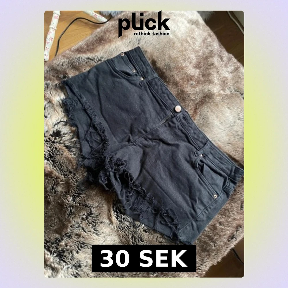 Svarta jeansshorts med fransad och rå kant. Klassisk femficksmodell med knapp och dragkedja framtill. Shortsen har bälteshällor och en slim passform som sitter snyggt på kroppen. Perfekta för varma dagar och en chill streetstyle.