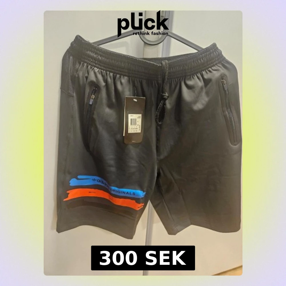 Svarta shorts från Adidas Originals med coola färgdetaljer i blått, orange och svart på ena benet. De har snörning i midjan, dragkedjeförsedda fickor och en loose passform. Materialet är mjuk polyester, perfekt för chill eller träning.