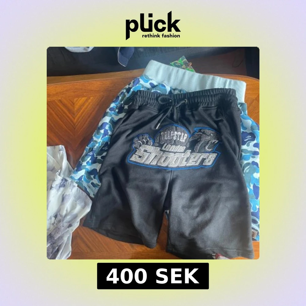 Svarta shorts med blå och grå tryck från Trapstar London Shooters. De har snörning i midjan och ett stort grafiskt tryck framtill. Perfekta för en avslappnad streetwear-look.