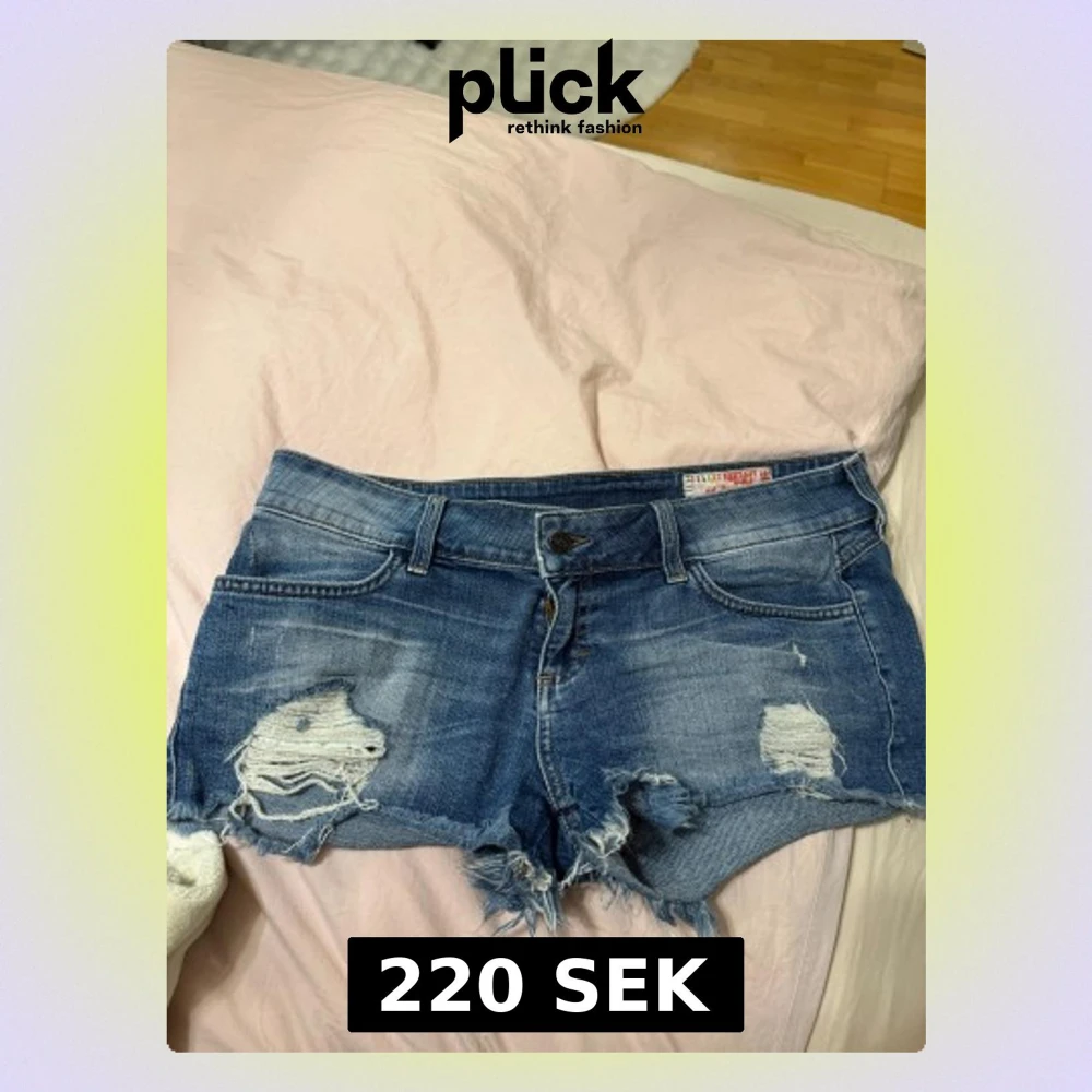Snygga blå jeansshorts med slitna detaljer och fransig kant. Framtill har de coola hål och bakfickorna är broderade med ett unikt mönster. Klassisk femficksmodell och knappstängning. Perfekt för dig som gillar streetstyle och vill sticka ut. Pris går att diskutera💕