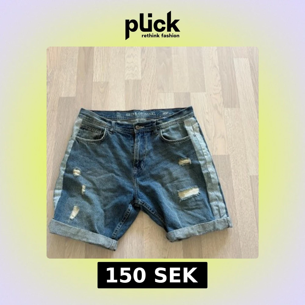 Snygga blå jeansshorts från Shine Original i loose fit-modell. De har slitna detaljer, upprullade benslut och klassiska fem fickor. Shortsen har en ljusare rand längs sidorna som ger en cool kontrast. Perfekta för en avslappnad stil under sommaren. Knappt använda
