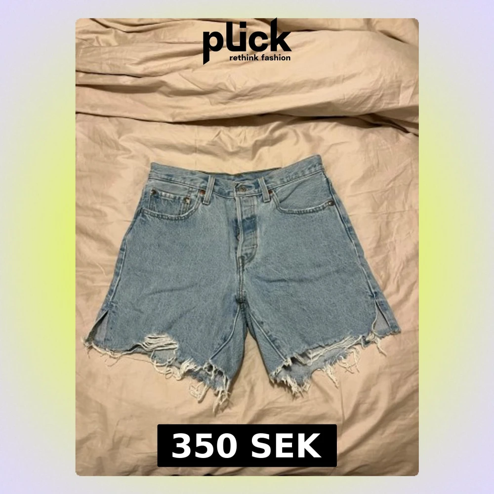 Säljer ett par klassiska Levi's 501 jeansshorts i ljusblå denim. De är högmidjade med råa, fransiga kanter och slitna detaljer längst ner. Shortsen har fem fickor, knappgylf och är tillverkade i bomull. Perfekta för en chill sommarstil.