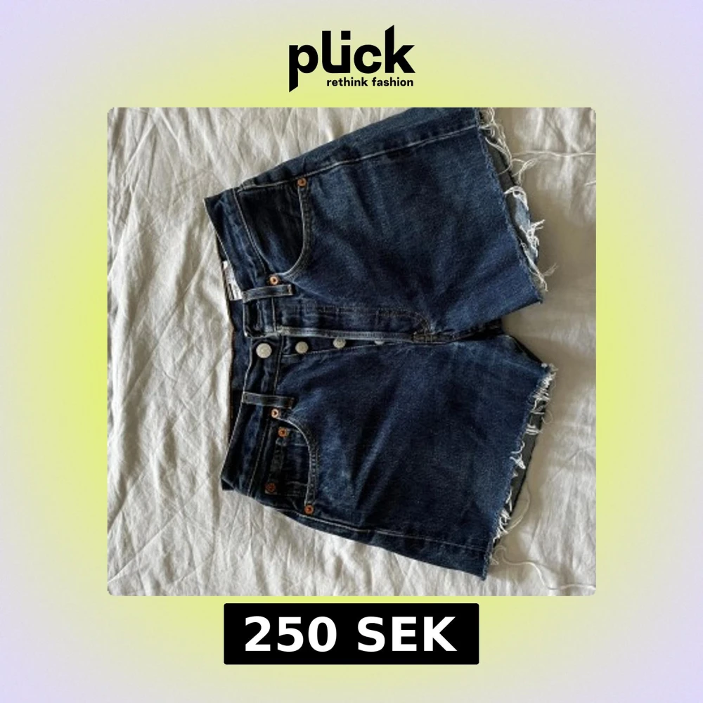 Klassiska Levi's 501 jeansshorts i mörkblå denim med råa, fransiga benslut och knäppning med knappar. Shortsen har fem fickor och ikonisk läderpatch bak. Perfekta för en chill sommarstil.