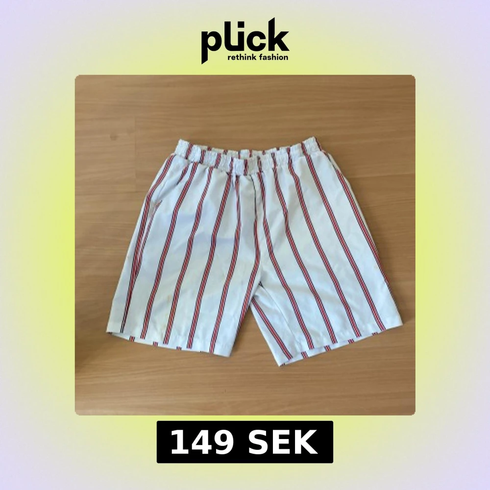 Säljer ett par vita shorts med röda och blå ränder. De har en elastisk midja för extra komfort. Perfekta för en avslappnad sommarstil.