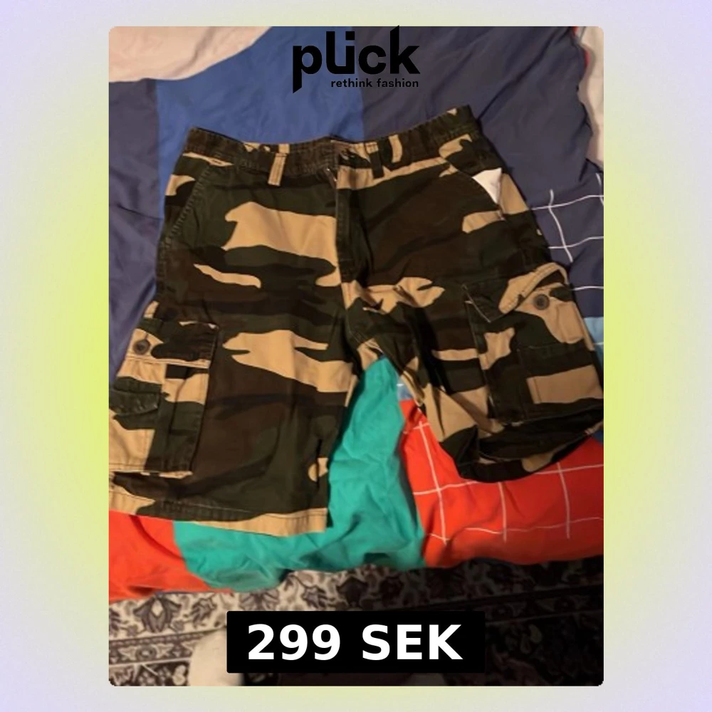 Säljer ett par cargoshorts i klassiskt camouflage-mönster med flera stora fickor på sidorna. Shortsen är i grönt, beige och svart och har bälteshällor samt knappstängning. Perfekta för dig som gillar streetwear och vill ha en avslappnad stil.