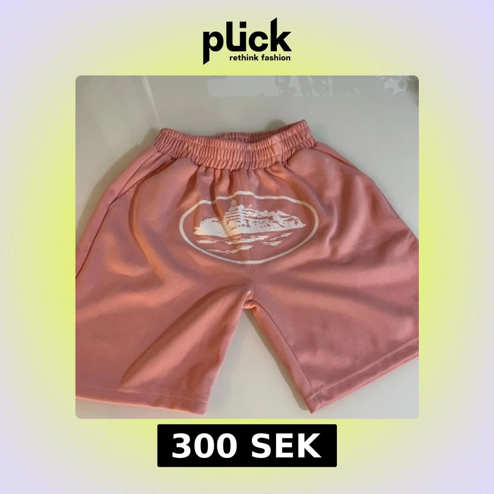 Snygga rosa shorts med elastisk midja och ett vitt tryck framtill. De har en avslappnad passform, sidofickor och en bakficka. Perfekta för varma dagar och chill vibes. Materialet känns mjukt och skönt mot huden.