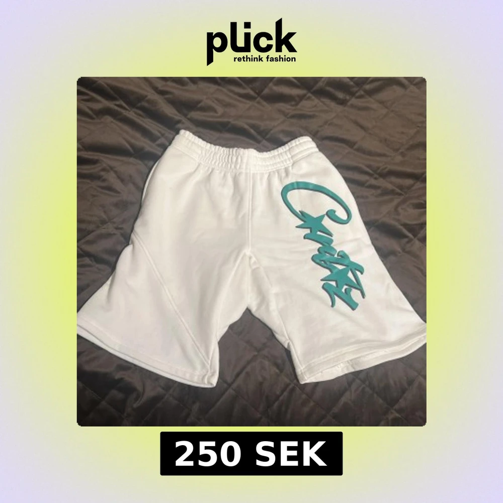 Snygga vita shorts med en cool turkos text på sidan. De har en elastisk midja för extra komfort och en bakficka. Perfekta för en avslappnad stil.