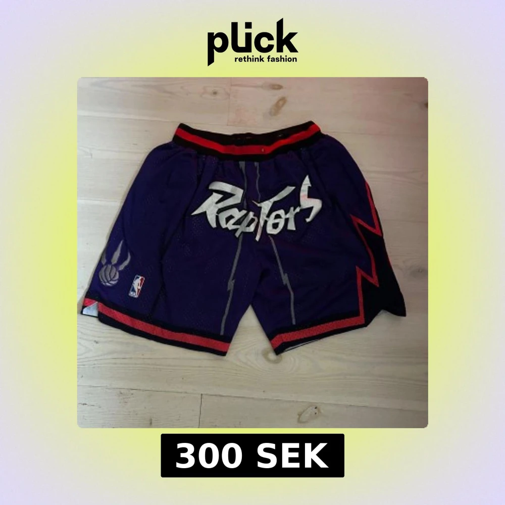 Säljer ett par lila Toronto Raptors shorts från Just Don med coolt blixtmönster och lagets logga. Shortsen har en elastisk midja med röd och svart rand. Perfekta för basketfans som vill sticka ut!