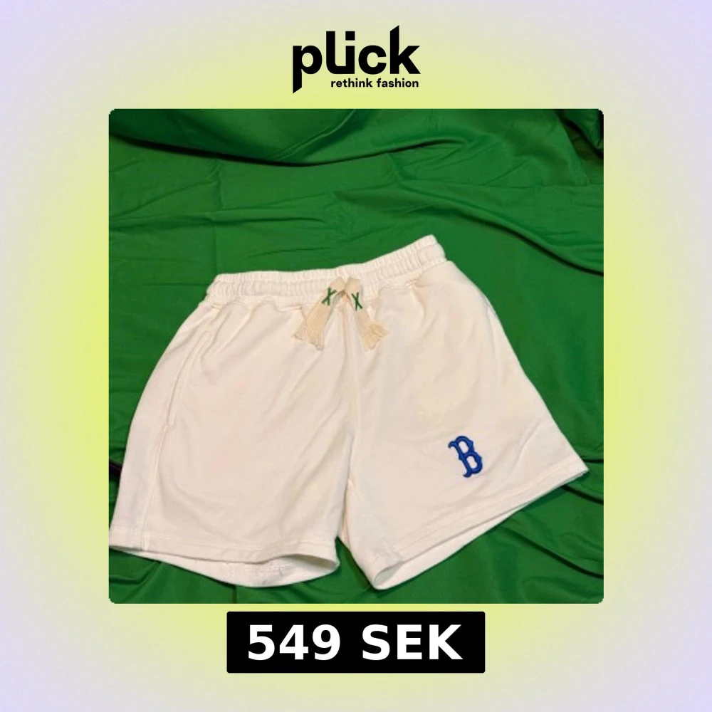 Snygga vita shorts från MLB med blå B-logga broderad på vänster ben. De har elastisk midja med snörning och tofsar, samt fickor på sidorna och en bakficka. Perfekta för chill dagar och sportiga vibes.Liknande modell som originalet!