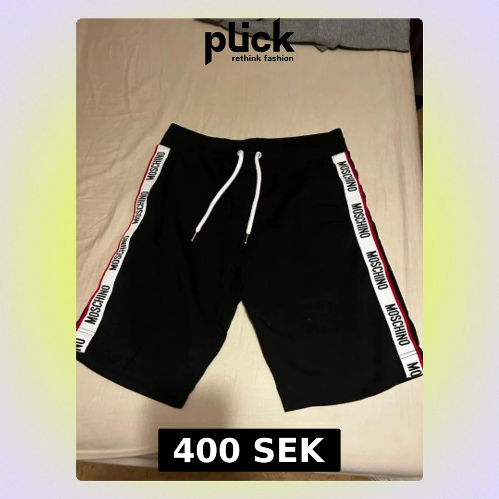 Svarta shorts från Moschino med vita snören i midjan och vita sidopaneler med Moschino-logga och röd kant. Mjukt material och bakficka med tryckt logga. Perfekta för chill eller träning.