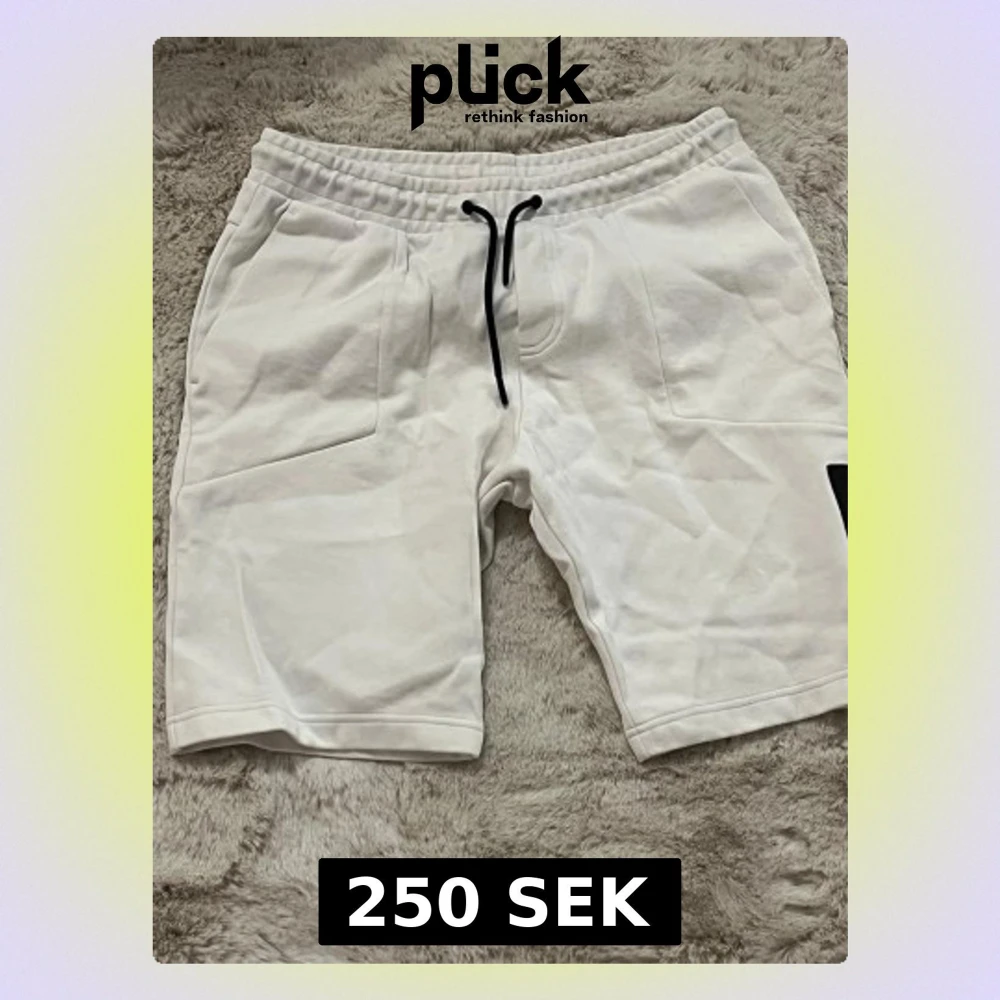 Säljer ett par vita shorts från Peak Performance med svart snörning i midjan och en svart patch med logga på ena benet. Shortsen har fickor fram och en bakficka, tillverkade i mjuk bomull för en chill och sportig vibe.