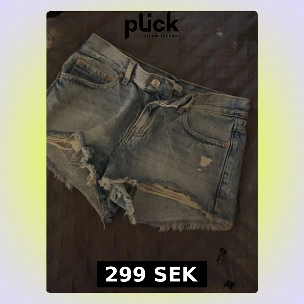Säljer ett par ljusblå denimshorts från Perfect Jeans i storlek 32. De är högmidjade med råa, fransiga kanter och slitna detaljer framtill för en riktigt chill vibe. Klassisk femficksmodell och bälteshällor. Perfekta till sommaren!