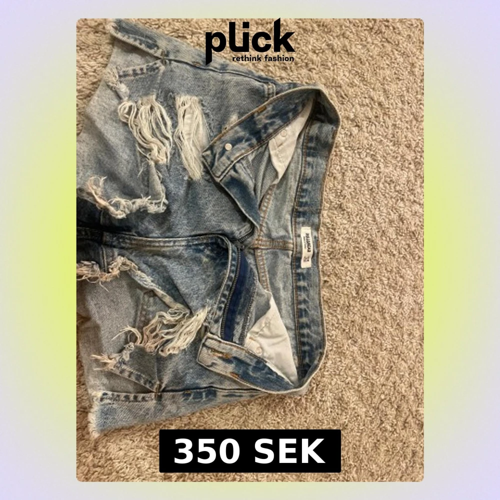 Säljer ett par blåa jeansshorts från Pull&Bear med hög midja och rejält slitna detaljer framtill. Shortsen har fransiga benslut, klassiska fickor och bälteshällor. Perfekta för en chill sommarlook.