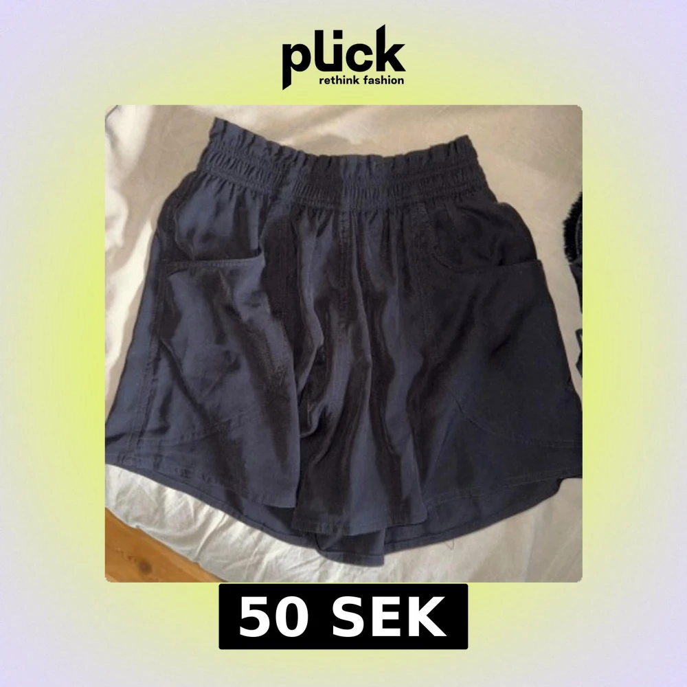 Säljer ett par svarta shorts med bred resår i midjan och två stora fickor framtill. Shortsen har en avslappnad passform och är perfekta för varma dagar. Materialet känns mjukt och lätt, vilket gör dem bekväma att bära.