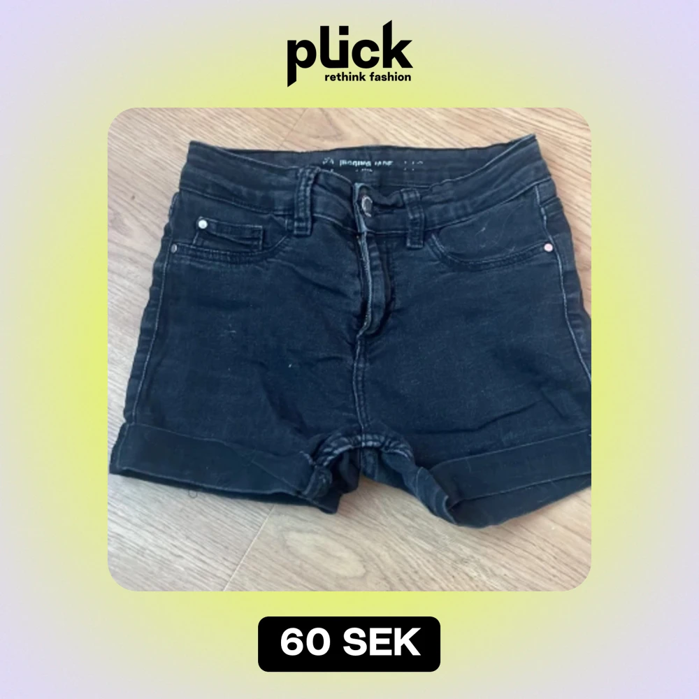 Ett par svarta jeansshorts med låg midja. Shortsen har en dragkedja och knapp framtill samt fickor både fram och bak. De är i ett välanvänt skick.