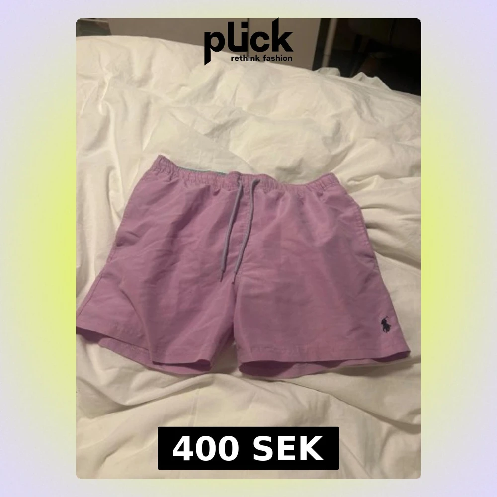 Säljer ett par lila badshorts från Polo Ralph Lauren med elastisk midja och snörning. Shortsen har meshfoder, bakficka och den klassiska Polo-loggan broderad framtill. Perfekta för sommardagar vid stranden eller poolen.