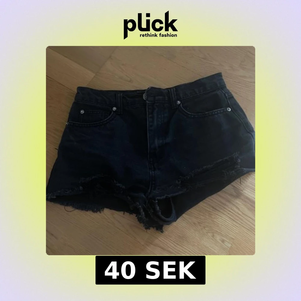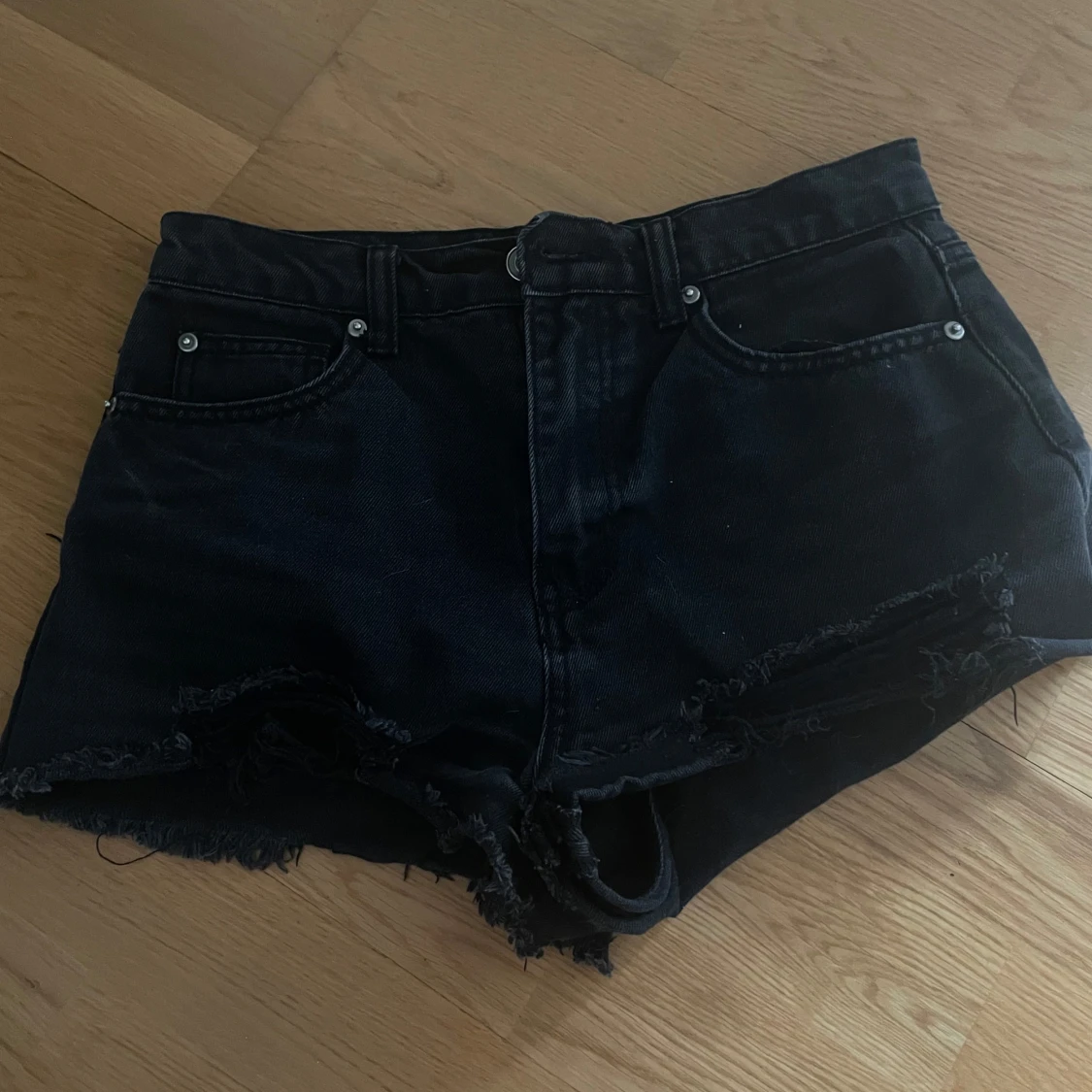 Snygga svarta jeansshorts med råa, fransiga kanter och slitna detaljer. Klassisk femficksmodell med knapp och dragkedja framtill. Perfekta för en avslappnad och cool stil under varma dagar.