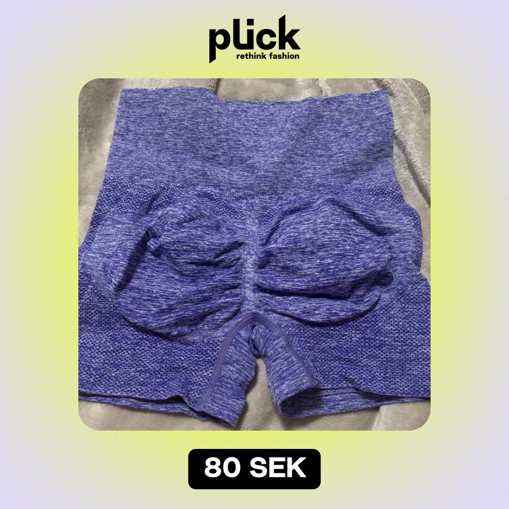 Säljer ett par blå träningsshorts i mycket bra skick. De är högmidjade och har en tight passform som ger bra stöd under träningen. Materialet är stretchigt och bekvämt, perfekt för intensiva träningspass. Shortsen har en snygg scrunch.