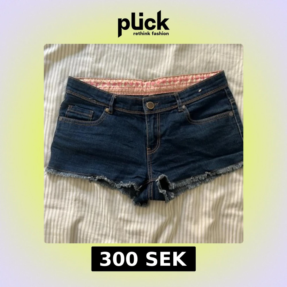 Snygga mörkblå jeansshorts med fransad kant och klassiska fem fickor. Shortsen har synliga kontrastsömmar och knappstängning fram. Insidan av midjan har ett rosa mönstrat tyg som ger en extra detalj. Perfekta för varma dagar och chill stil.
