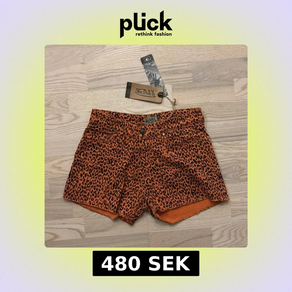 Snygga orangea shorts från Von Dutch med svart leopardmönster. Klassisk femficksmodell med kanter och logga tryckt baktill i midjan. Helt nya med tag. Ganska små i stl, tippar mer på XS.