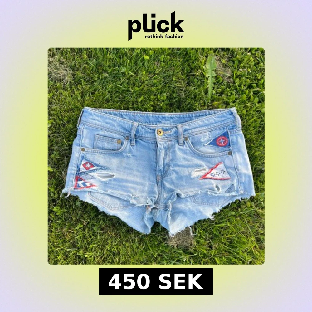 Säljer ett par ljusblå lågmidjade jeansshorts med slitningar och färgglada patches i rött, vitt och blått.