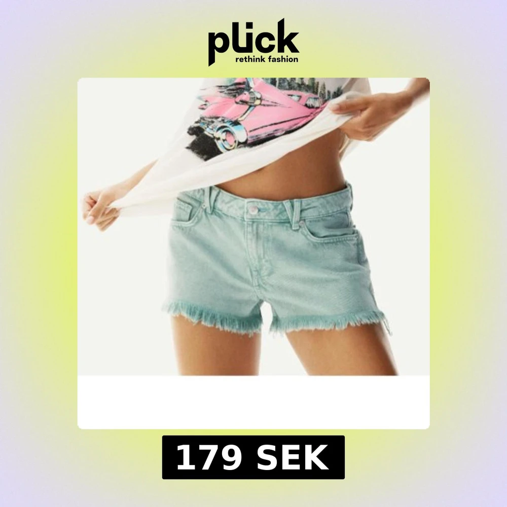 Snygga mintgröna jeansshorts från HM med fransar. De är i modellen ”regular waist”, men jag skulle säga att de är lågmidjade. De har klassisk femficksdesign, dragkedja och knapp framtill. De är endast testade och lapparna sitter kvar. Storlek: 32. Nypris: 249kr. Säljer för: 179kr!