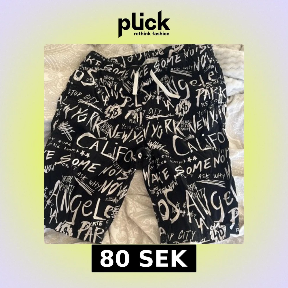 Coola svarta shorts från H&M med vitt textmönster som ger en urban känsla. De har en bekväm passform med snörning i midjan för justerbarhet. Perfekta för en avslappnad stil.