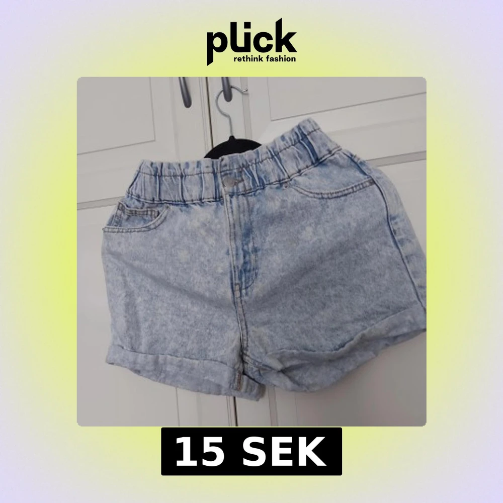 Säljer ett par ljusblåa högmidjade jeansshorts med elastisk midja och klassisk femficksdesign. Shortsen har en tvättad look och uppvikta benslut för en avslappnad vibe. Perfekta för varma dagar och enkel att matcha med allt.