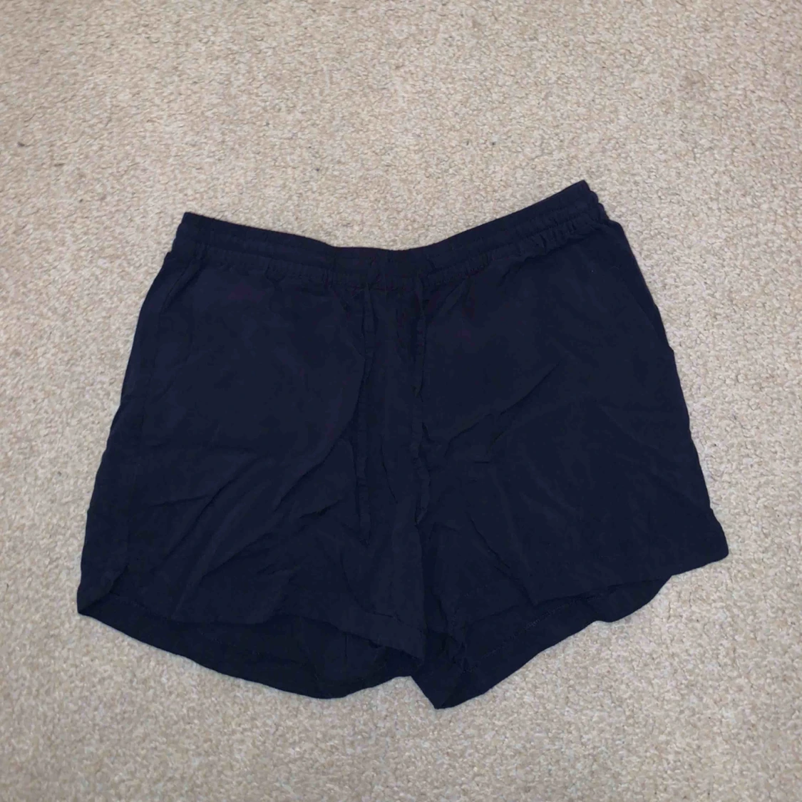 Ett par marina-blåa shorts med väldigt tunt tyg och snören i midjan aldrig använt!