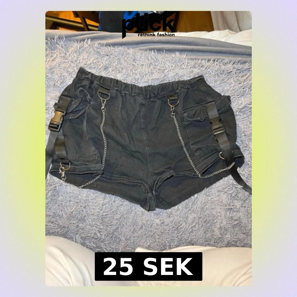 Svarta shorts från SHEIN i storlek XL med elastisk midja, coola kedjor och spännen på sidorna. De har fickor med lock och detaljer i metall som ger en edgy vibe. Materialet är mjukt och känns som bomull. Perfekt för dig som gillar streetstyle och vill sticka ut.
